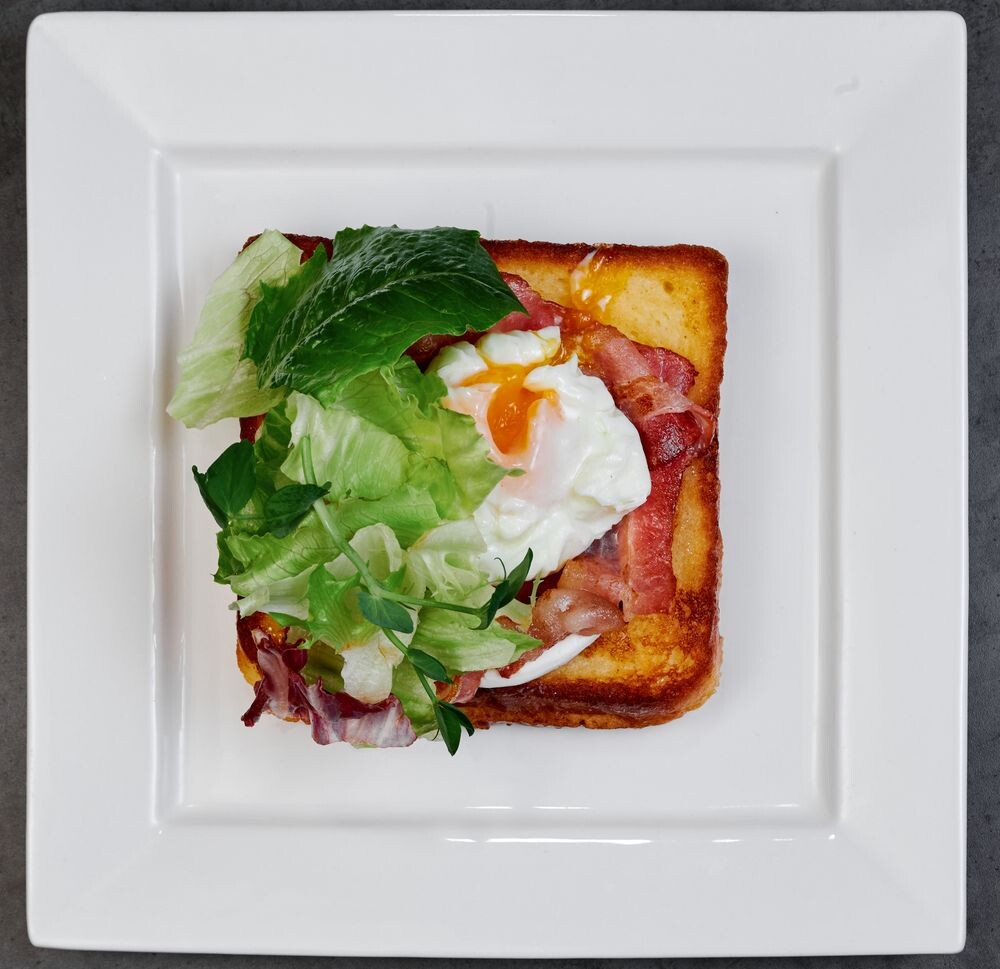 Завтрак «Французский тост с беконом, сыром и яйцом пашот»
